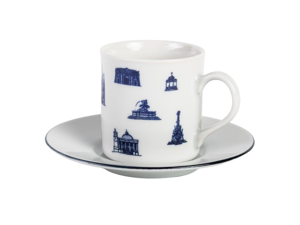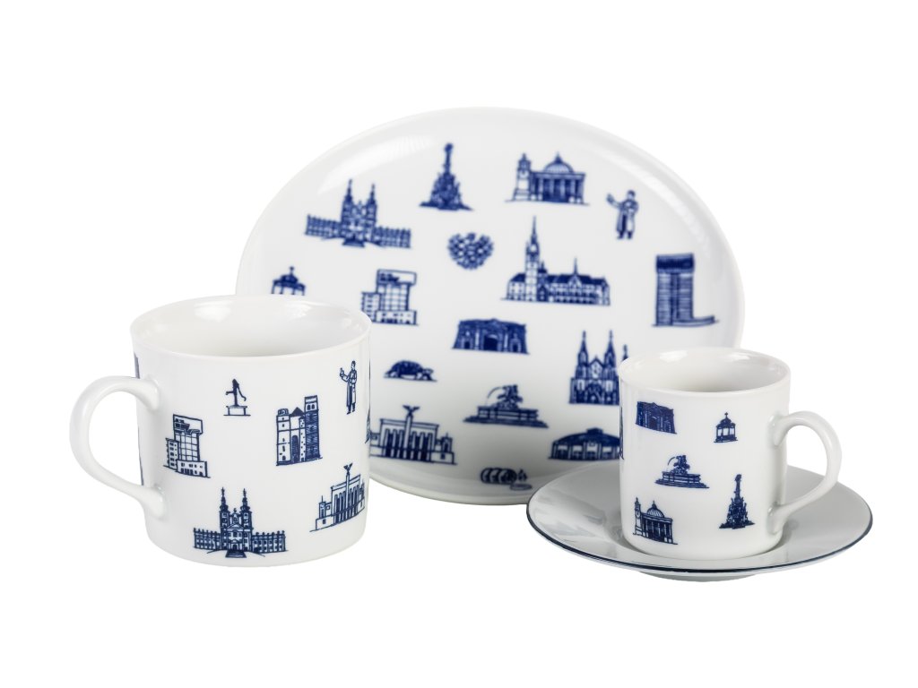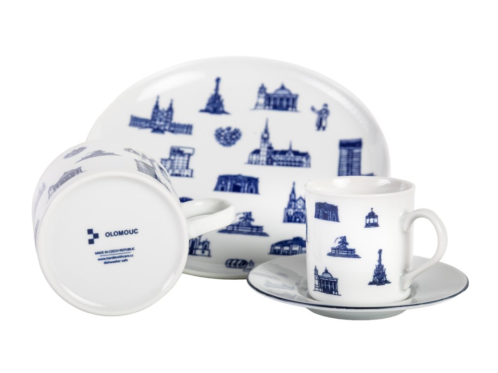 Designová porcelánová sada šálku a podšálku s bezmála dvaceti různými ilustrovanými symboly Olomouce. Kromě dominant, jako je olomoucká radnice, sloup Nejsvětější Trojice, katedrála svatého Václava či Caesarova kašna na něm najdete vyobrazenou například také budovu olomouckého nádraží, vodojem i olomoucké tvarůžky.
