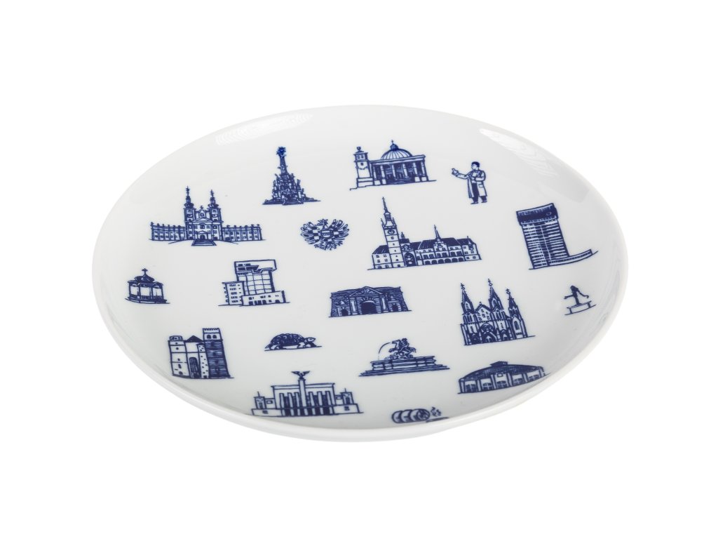 Designový porcelánový talíř s bezmála dvaceti různými ilustrovanými symboly Olomouce. Kromě dominant, jako je olomoucká radnice, sloup Nejsvětější Trojice, katedrála svatého Václava či Caesarova kašna na něm najdete vyobrazenou například také budovu olomouckého nádraží, vodojem nebo olomoucké tvarůžky.